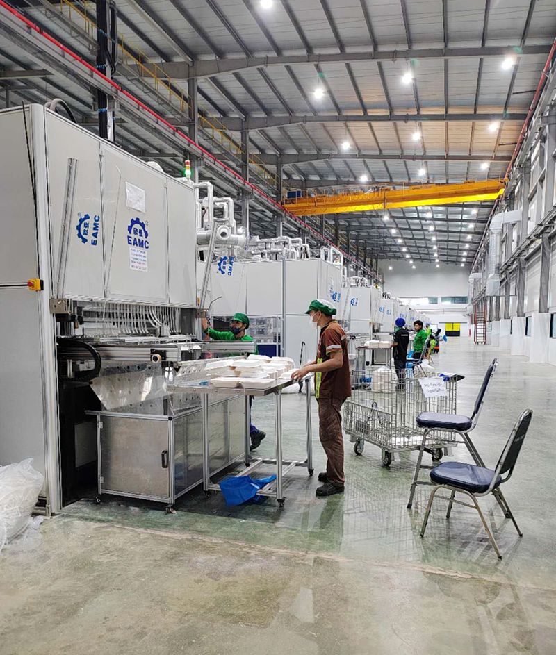 世界最大的糖企-泰國(guó)KTIS集團(tuán)購(gòu)買(mǎi)50臺(tái)EAMC全自動(dòng)紙漿模塑設(shè)備 在國(guó)際禁塑的大環(huán)境下,在KTIS集團(tuán)下屬的著名蔗渣漿廠EPPCO第一期購(gòu)買(mǎi)了歐亞輕工EAMC的4條生產(chǎn)線并投入了使用的基礎(chǔ)上,泰國(guó)KTIS集團(tuán)決定投資成立新的(第二期)全自動(dòng)紙漿模塑工廠EPAC,生產(chǎn)各種紙漿模塑產(chǎn)品。經(jīng)過(guò)對(duì)全世界各種紙漿模塑設(shè)備的考察篩選,泰國(guó)KTIS集團(tuán)一次性購(gòu)買(mǎi)了50臺(tái)EAMC全自動(dòng)紙漿模塑成型定型切邊一體機(jī)生產(chǎn)線。這是歐亞輕工的又一個(gè)大型回頭客。