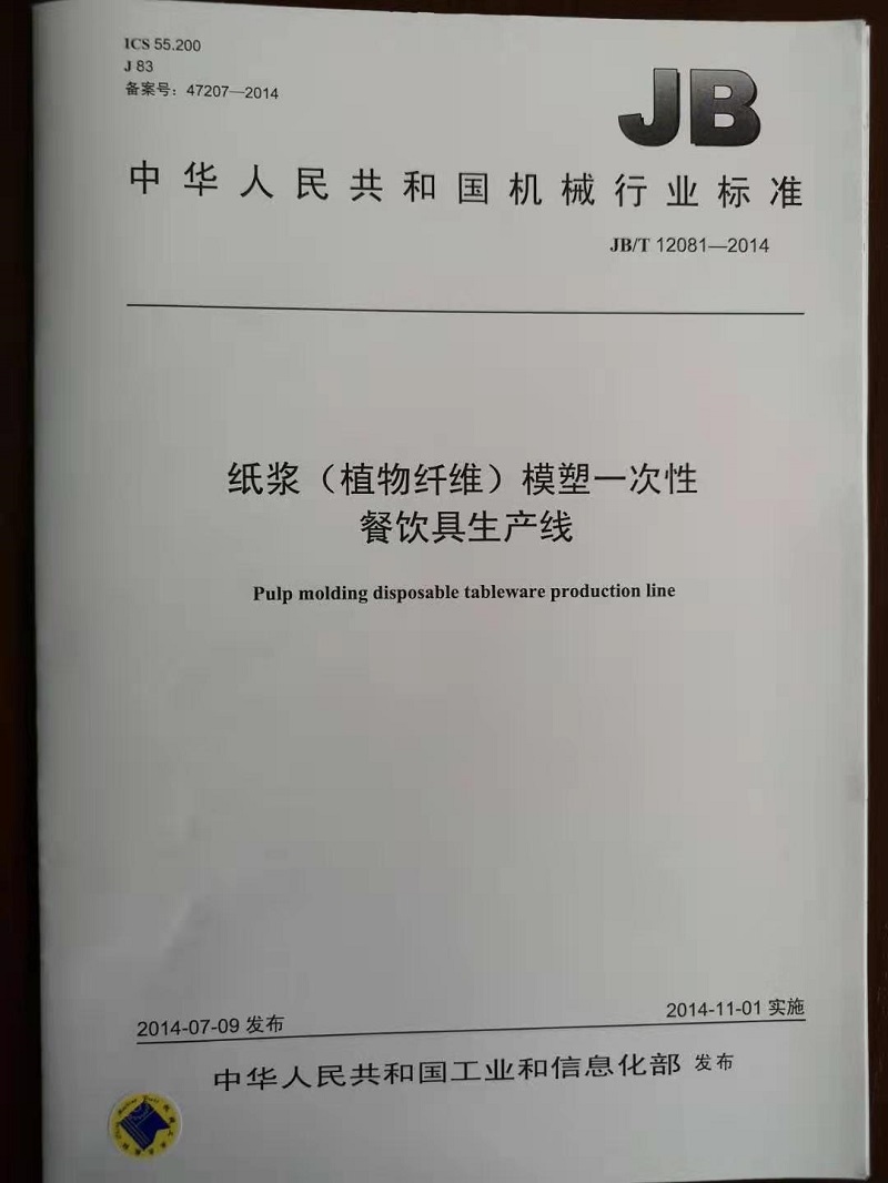 中華人民共和國行業(yè)標(biāo)準(zhǔn):?紙漿(植物纖維)模塑一次性餐飲具生產(chǎn)線?2014-11-1實(shí)施。標(biāo)準(zhǔn)代號(hào)JB/T 12081-2014。本標(biāo)準(zhǔn)由鄭天波起草。是關(guān)于環(huán)保餐具設(shè)備生產(chǎn)線的紙漿模塑設(shè)備方面的第一個(gè)行業(yè)標(biāo)準(zhǔn)。